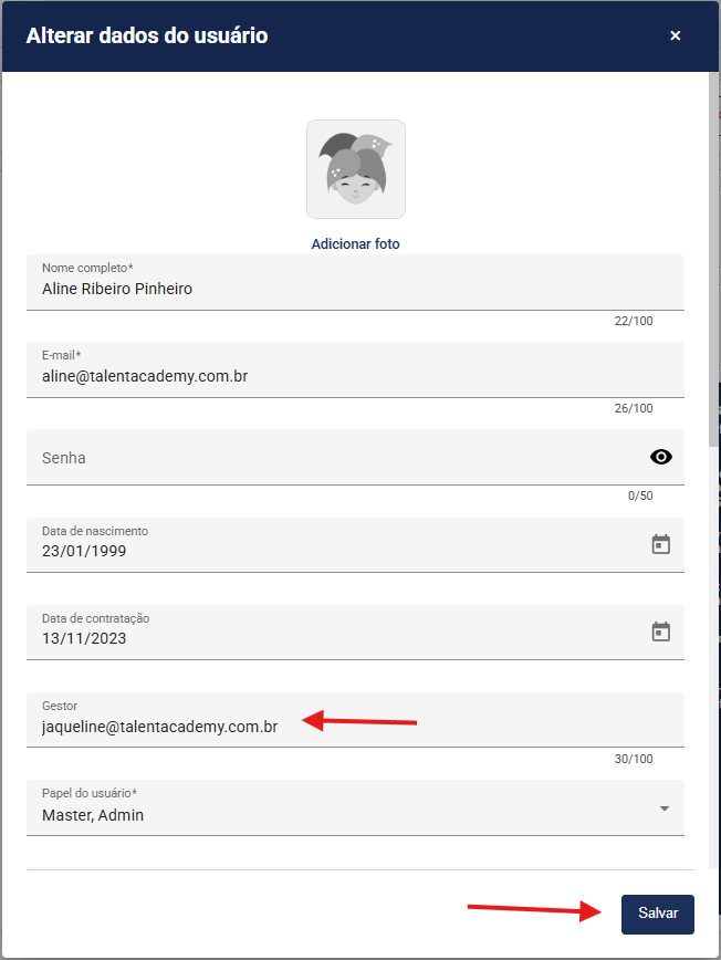 5. Alterar o gestor colocando um e-mail de usuário válido e “Salvar”
