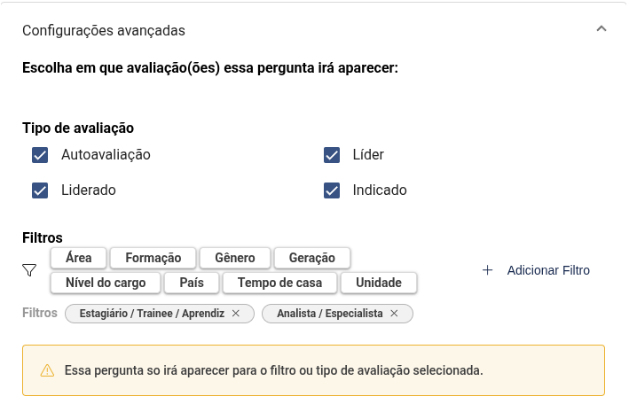 Ao configurar a pergunta, clique na opção Configurações Avançadas. É aqui que você poderá definir:- Os tipos de avaliação nos quais a pergunta deve aparecer (como Autoavaliação, Líder, Indicado etc.);
