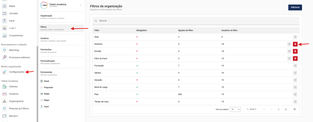 OBS: só é possível deletar filtros criados pela sua organização, para desativar um filtro padrão acesse a parte de Personalização