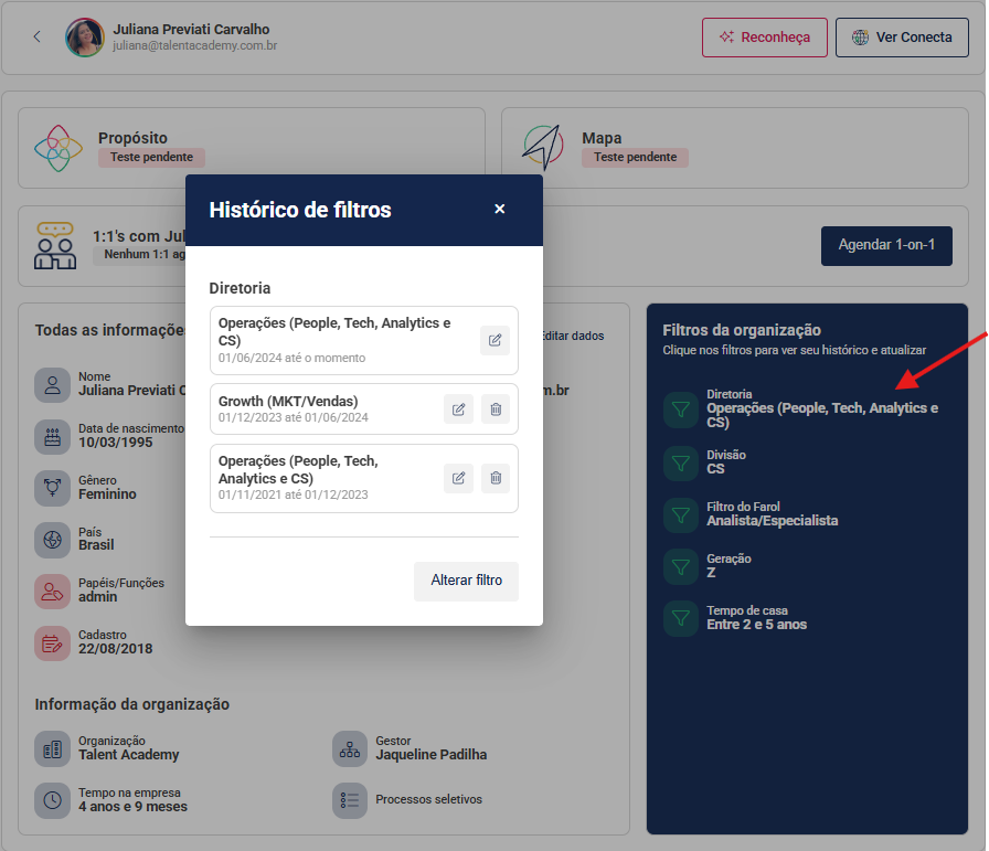 Caso tenha dúvidas de qual filtro estava ativo em uma data específica, é possível ver o detalhamento e histórico dos filtros de um usuário específico.